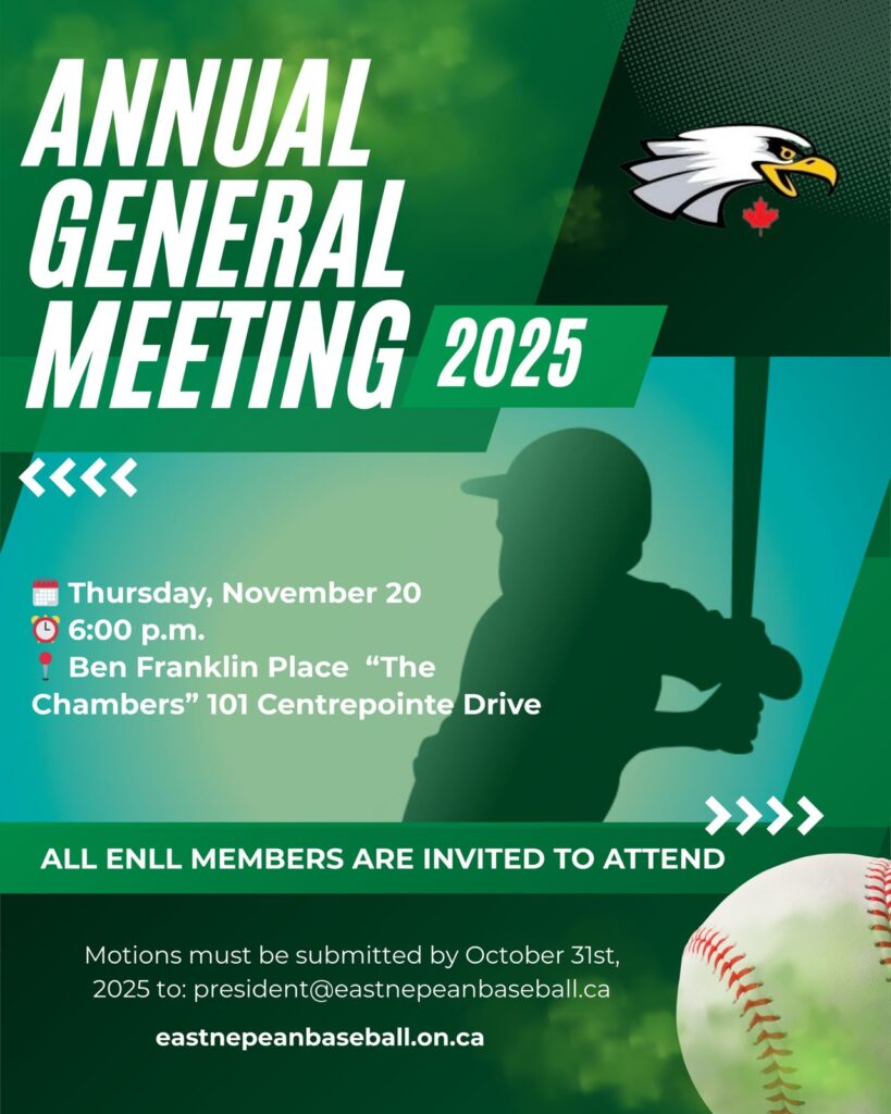 Motions to be presented at the AGM must be received by President Bruce Campbell at president@eastnepeanbaseball.ca by Friday, October 31, 2025, to be considered for the meeting.